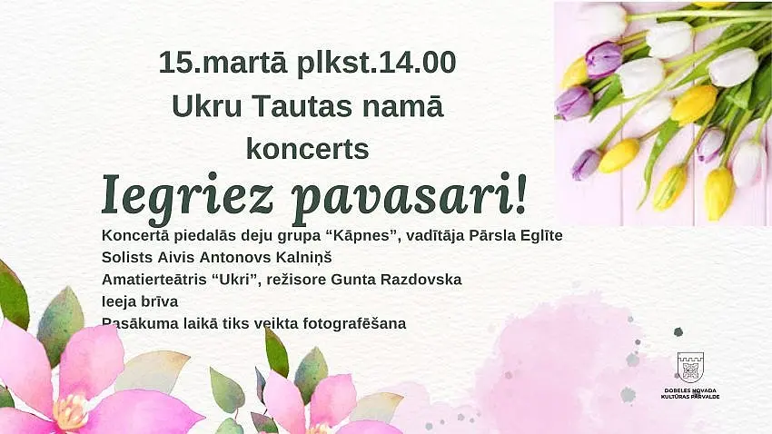 Ir puteņu mēnesis februāris, bet laukā jaušams pavasara tuvums- zied sniegpulkstenīši, debesīs redzami gulbju kāši, kāda tur vairs ziema! Tāpēc Ukru Tautas nams 2025. gada 15.martā plkst.14.00 visus laipni aicina uz koncertu “Iegriez pavasari!”. Koncerts veltīts gan pavasarim, gan Sieviešu dienai.