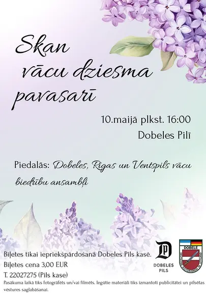 Dobeles novada muzeja filiālē Dobeles Pils 10. maijā plkst. 16:00 norisināsies Dobeles pilsētas kultūras nama un vācu kultūras biedrības ansambļa “Die Lustigen” koncerts “Skan vācu dziesma pavasarī”. Koncertā piedalīsies arī Rīgas un Ventspils vācu biedrību ansambļi.