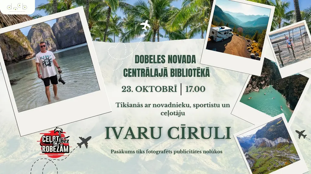23. oktobrī plkst. 17.00 Dobeles novada Centrālajā bibliotēkā aicinām uz tikšanos ar raidījumu "Ceļot bez robežām" un "Atrasts Baltijā" radītāju un bijušo pasaules čempions spēka trīscīņā Ivaru Cīruli.