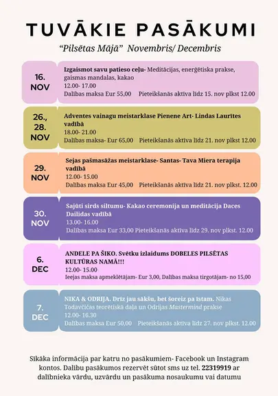 Sīkāka informācija par katru pasākumu – Pilsētas Mājas Facebook un Instagram kontos vai pa tel 22319919. norādot dalībnieka vārdu, uzvārdu un pasākuma nosaukumu vai datumu.