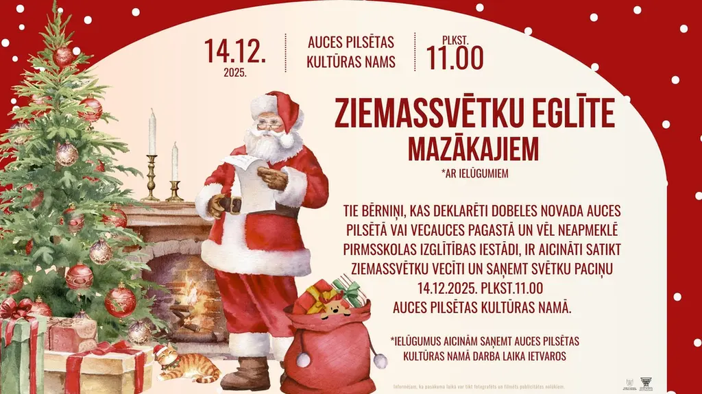 Aicinām pašus mazākos, kuri deklarēti Auces pilsētā vai Vecauces pagastā un vēl neapmeklē pirmsskolu, satikt Ziemassvētku vecīti un saņemt savu svētku paciņu!