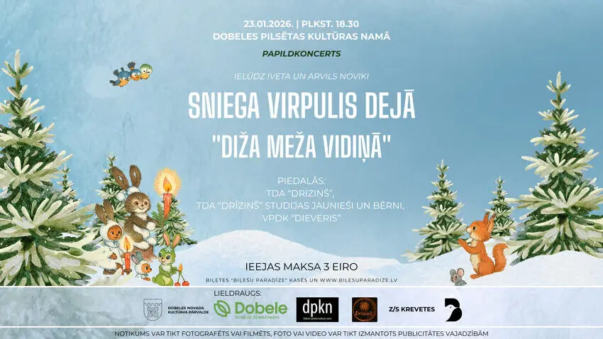 2026. gada 23. janvārī plkst. 18.30 Iveta un Arvils Noviki ielūdz Jūs uz tautas deju koncertu “Sniega virpulis dejā – diža meža vidiņā” Dobeles pilsētas Kultūras namā!