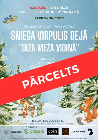 2026. gada 6. februārī plkst. 18.30 Iveta un Arvils Noviki ielūdz Jūs uz tautas deju koncertu “Sniega virpulis dejā – diža meža vidiņā” Dobeles pilsētas Kultūras namā!