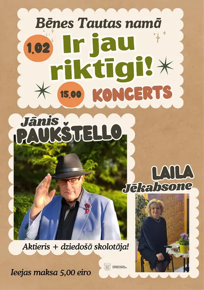 612387992-122258609204082694-830455456315139092-n.webpKopīgā koncertprogrammā apvienojušies Tautā mīlētais aktieris Jānis Paukštello un talantīgā dziedošā skolotāja Laila Jēkabsone. Ikviens mīļi gaidīts!