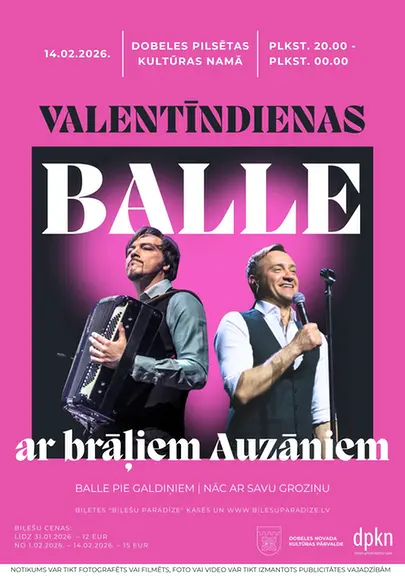2026. gada 14. februārī aicinām uz Valentīndienas balli ar brāļiem Auzāniem un bundzinieku, kur mūzika un dejas radīs īpašu vakara noskaņu.